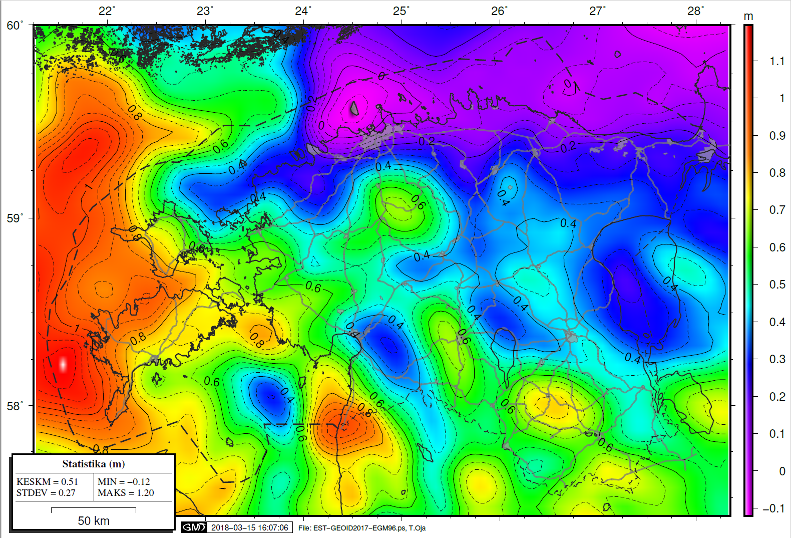 EST-GEOID2017 ja EGM96 mudelitel baseeruvad ortomeetriliste kõrguste vahe (ehk mõlema geoidi undulatsioonide vahe) sõltub punkti geograafilisest asukohast. Allolev kaart näitab nende kahe mudeli undulatsioonide vahet Eestis.